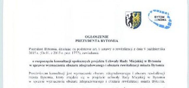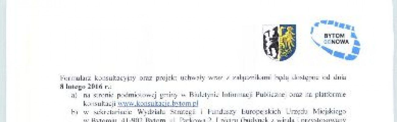 i obszaru rewitalizacji w Bytomiu. Tego dnia w sali sesyjnej bytomskiego magistratu o godzinie 14.00 odbędzie się spotkanie konsultacyjne, na którym eksperci Instytutu Rozwoju Miast zaprezentują obszar rewitalizacji Bytomia. Zapraszamy wszystkich zaiteresowanych. Opinie i uwagi interesariuszy będą zbierane do 2 marca 2016 r. w różnych formach: za pośrednictwem bytomskiej platformy konsultacji społecznych, drogą elektroniczną (e-mail) i korenspondencyjną. Swoje uwagi można zgłaszać również bezpośrednio