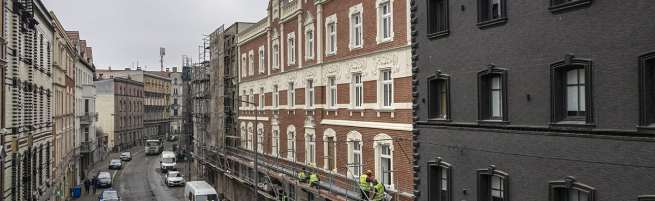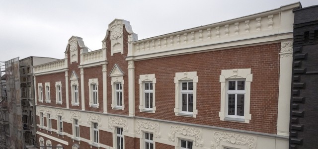 Realizująca inwestycję firma Efekt Sp. z o.o. zakończyła remont elewacji kolejnych z siedmiu remontowanych kamienic. Uwagę przyciągają odrestaurowane dekoracje sztukatorskie i wyczyszczona cegła klinkierowa, która po latach odzyskała swoją pierwotną kolorystykę.