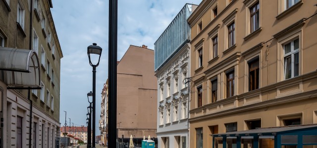 Zniknęły już rusztowania z elewacji kamienicy przy ul. Rycerskiej 1. Uwagę zwracają misternie odtworzone detale architektoniczne oraz dobudowana kondygnacja przywołująca na myśl koronę. Wewnątrz trwają intensywne prace wykończeniowe.
